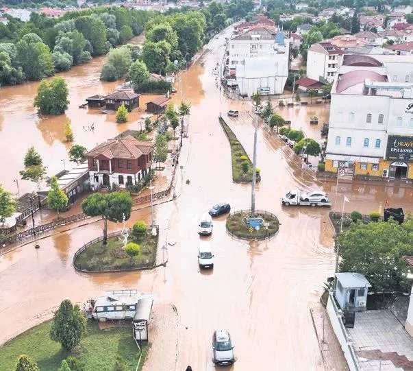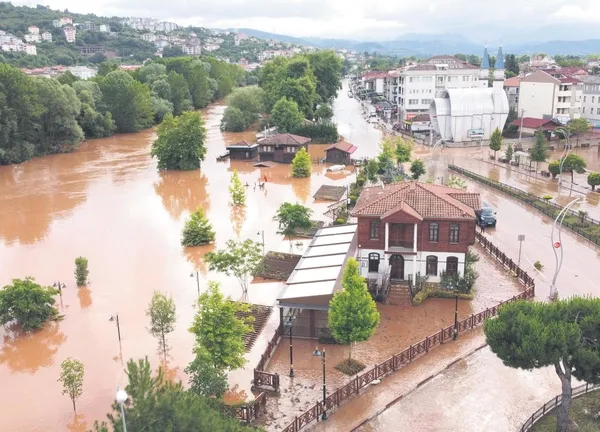 Düzce'de sağanak yağış nedeniyle Melen Çayı taştı, Düzce küçük sanayi sitesi sular altında kaldı. Esnaf çamur ve balçıkları temizlemek için işyerlerine yaya olarak ya da arazi aracı bularak ulaşmaya çalıştı.