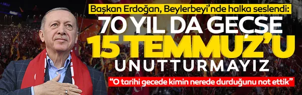 Son dakika haberi: Başkan Recep Tayyip Erdoğan, 15 Temmuz Demokrasi ve Millî Birlik Günü kapsamında Beylerbeyi'nde düzenlenen programda önemli mesajlara yer verdi. Başkan Erdoğan, 15 Temmuz'u unutturmayacaklarının vurgusunu yaparken, CHP lideri Kemal Kılıçdaroğlu'nun o tarihi gecedeki tutumuna ayrı bir parantez açtı.