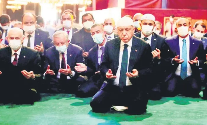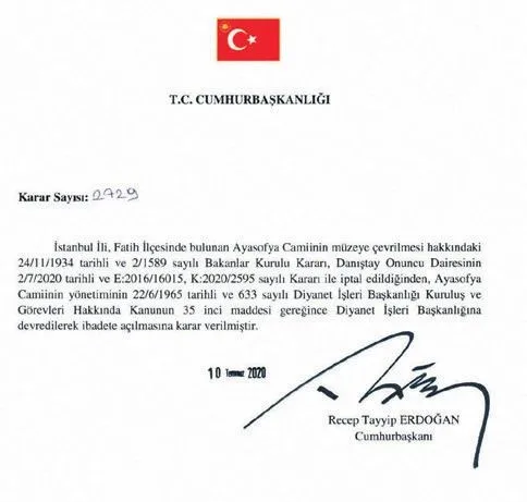 Erdoğan, aynı gün Ayasofya'nın yeniden ibadete açılmasına ilişkin kararnameyi imzalayarak, sosyal medya hesabından "Hayırlı olsun" notunu paylaştı. Müze statüsünden çıkmasıyla Erdoğan, Ayasofya-i Kebir Cami-i Şerifi'nin 24 Temmuz 2020'de, cuma namazıyla ibadete açılacağını duyurdu. Erdoğan, cami içinde Fatiha Suresi'ni ve Bakara Suresi'nin ilk 5 ayetini okudu. 4 minareden 4 müezzinle ezan okundu. Muhammed UZUN/SABAH