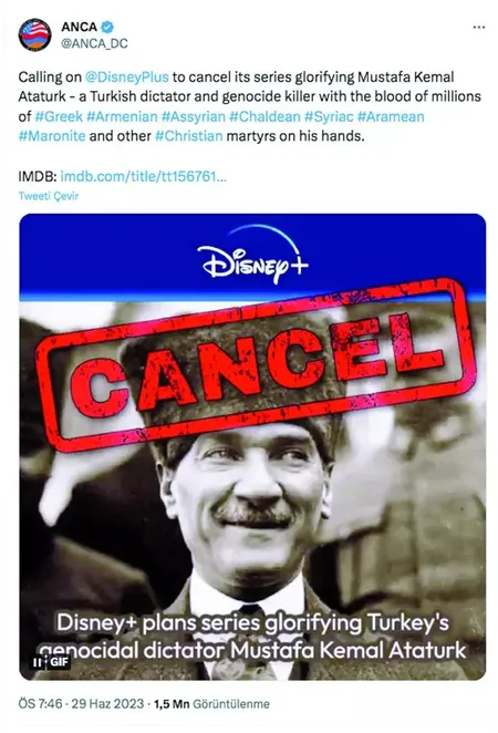 Yerli içeriklerini kaldırma kararı alan Disney Plus, daha önce yayınlayacağını duyurduğu Atatürk dizisini iptal etti. Hemen her olaya sosyal medya hesaplarından tepki gösteren sözde muhalifler ve sanat camiası ise Ermeni lobisine boyun eğen Disney Plus'a karşı ses çıkarmadı.