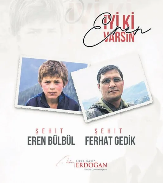 Başkan Erdoğan, 11 Ağustos 2017'de Trabzon Maçka'da teröristlerce şehit edilen Eren Bülbül ve Jandarma Astsubay Ferhat Gedik'i andı. Erdoğan, sosyal medya paylaşımında "Koca yürekli Eren'imizin ve Jandarma Astsubayımız Ferhat Gedik'in şehadetlerinin üzerinden 6 yıl geçti. Vatanımızı korkusuzca savunan Eren evladımızın ve aziz şehitlerimizin kanını yerde bırakmadık, bırakmayacağız. Terör örgütü PKK ve uzantılarıyla mücadelemiz devam edecek" ifadelerini kullandı. Erdoğan paylaşımına, "İyi ki varsın Eren" notuyla Bülbül ve Gedik'in fotoğraflarını da ekledi