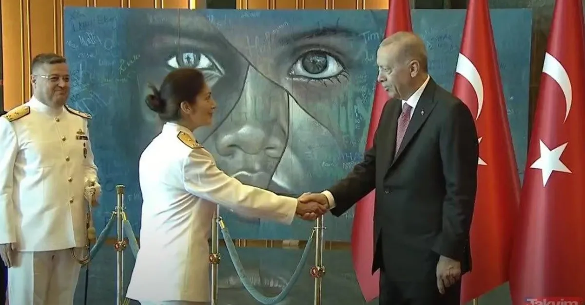 Başkan Erdoğan, Külliye'de 30 Ağustos tebriklerini "Mülteci Çocuk" temalı tablonun önünde kabul etti. Erdoğan'a tebriklerini sunanlar arasında Deniz Kuvvetleri Komutanlığı'nın ilk kadın tuğamirali Gökçen Fırat da yer aldı. Erdoğan, kadın amirale "Sen benim hemşerimdin değil mi?" diye sordu ve diğer komutanlara "Bu da Rizeli hemşerim" dedi. Kadın amiral de 'Sağolun efendim' diye cevap verdi.