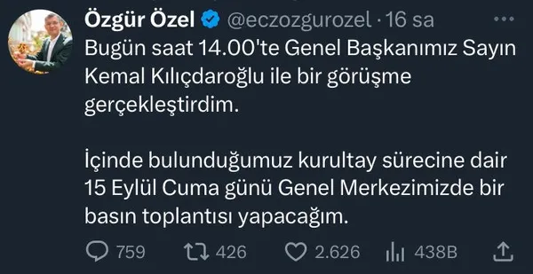 Sosyal medya hesabından CHP Genel Başkanı Kemal Kılıçdaroğlu ile görüşme gerçekleştirdiğini söyleyen Özel'in Cuma günü CHP İzmir İl Kongresi'ne katılıp genel başkanlığı adaylığı için destek beklediği öğrenilirken, Özel'in gönderme içeren paylaşımı ekibi tarafından desteklendi.