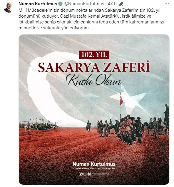 TBMM Başkanı Numan Kurtulmuş, Sakarya Zaferi'nin 102'nci yılınına ilişkin sosyal medya hesabından bir mesaj paylaştı.