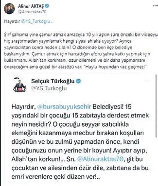 İP Parti Bursa Milletvekili Selçuk Türkoğlu, 10 sene önceki videoyu yeni gibi paylaştı. "Hayırdır @bursabüyükşehir Belediyesi! 15 yaşındaki bir çocuğu 15 zabıta memuruyla derdest etmek neyin nesidir? Sn.@Alinuraktaş70, git bu çocuktan ve ailesinden özür dile" diye sosyal medyadan yorum yaptı.