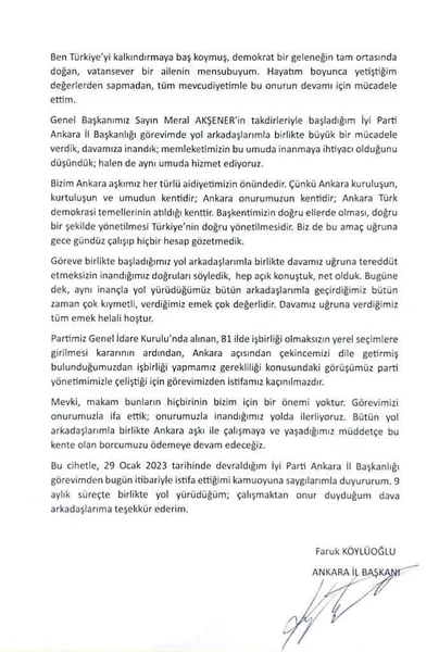 Kurulduğu günden bu yana 200 kurucu üyesinin neredeyse yarısı istifa eden İYİ Parti, bir kez daha istifa krizine tutuldu. Son 2 seçimdir CHP ile kol kola yürüyen Akşener, bu kez yerel seçimlere "ittifaksız" gireceklerini açıklayınca partililer arasındaki homurdanmalar arttı. Alınan karardan rahatsız olduğu uzun süredir konuşulan Ankara İl Başkanı Faruk Köylüoğlu, kulislerde konuşulan hamlesini yaparak genel merkeze istifasını sundu. Beraberindeki 57 üye ile birlikte istifa eden Köylüoğlu, parti içinde yeni bir krizi de tetiklemiş oldu.