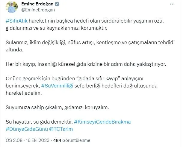Dünya Gıda Günü dolayısıyla sosyal medya hesabından paylaşımda bulunan Emine Erdoğan, "Sıfır Atık" hareketinin başlıca hedefi olan sürdürülebilir yaşamın özünün, gıdaları ve su kaynaklarını korumak olduğunu belirtti.
