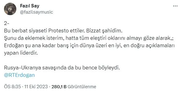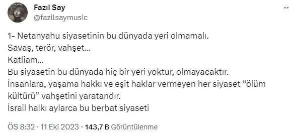 23 Ekim Zürih, 24 Ekim Bern, 25 Ekim Cenevre ve 26 Ekim Luzern'deki bu konserlerde Birmingham Orkestrası ile beraber sahneye çıkmam, bu karar sebebi ile mümkün olmayacak. Sanatseverlere iletmek isterim. Ortadoğu krizi sürecinde; toplam 3 tweet ve bir de konuşma yaptığım video yayınladım. Ben barıştan yanayım. Tüm açıklamalarım da barış içindi. Ve her zaman iyiden, uzlaşıdan, güzel bir geleceğin beraber yaratılmasından yana oldum.