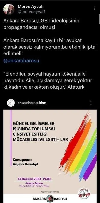 Ankara Barosu tarafından 14 Haziran'da düzenlenen "Güncel Gelişmeler Işığında Cinsiyet Eşitliği Mücadelesi ve LGBT+lar" adlı konferansa sosyal medya hesabından tepki göstererek iptal edilmesini isteyen Avukat Merve Ayvalı, baro tarafından hakkında başlatılan disiplin soruşturması kapsamında tüm görevlerinden el çektirildi.