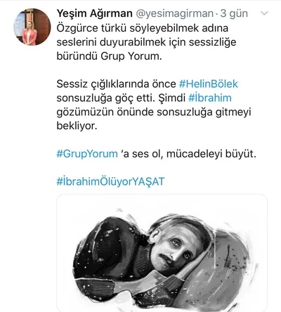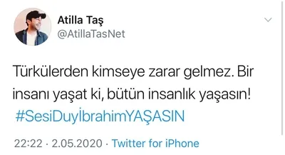 ATİLLA TAŞ: Fetullahçı Terör Örgütü'nden hüküm giymiş olan Atilla Taş ise "Türkülerden kimseye zarar gelmez. Bir insanı yaşat ki, bütün insanlık yaşasın! #SesiDuyİbrahimYAŞASIN" dedi.