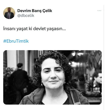 DHKP-C talimatıyla açlık grevine başlayan ve ölen İstanbul Barosu'na kayıtlı avukat Ebru Timtik'in ardından paylaşım yapan CHP'li Devrim Barış Çelik, "İnsanı yaşat ki devlet yaşasın." ifadelerini kullandı.