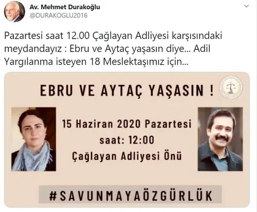 İstanbul Barosu Başkanı Mehmet Durakoğlu, sosyal medya hesabından yaptığı paylaşımla terör örgütü DHKP-C üyeliğinden hüküm giyen ve cezaevinde eylem başlatan Ebru Timtik ve Aytaç Ünsal için 'Onlara kayıtsız kalmayalım" çağrısı yaptı. Timtik ve Ünsal, Savcı Mehmet Selim Kiraz'ın şehit edildiği hain saldırının ardından başlatılan operasyonla yakalanarak tutuklanmıştı.