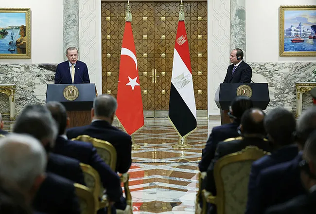 Türkiye ve Mısır bölgenin iki önemli ülkesidir. 12 yıldan bu yana irtibatlarımız kesilmişti. Dünya Kupasında Sayın Katar Emiri Şeyh Temim'in devreye girmesiyle orada bir araya geldik ve normalleşme sürecini başlatmış olduk. Mısır'a bu ziyaretimiz Sayın Sisi'nin çok ısrarlı davetiyle gerçekleşti. Ben de kendilerine Yüksek Düzeyli Stratejik Konsey Toplantımızın gerçekleştirilmesini, bu adımın atılmasını teklif ettim. Kendileri de bunu kabul ettiler. Dışişleri Bakanlarımız irtibatlarını devam ettirecekler. Büyük ihtimalle Sayın Sisi Nisan veya Mayıs'ta Ankara'ya gelerek iade-i ziyareti gerçekleştirmiş olacak. Mısır ile hem kültürel hem tarihsel anlamda birlikteliğimiz, köklü bağlarımız bulunuyor. Biz Mısır ile sadece aynı tarihi değil, aynı denizi de paylaşıyoruz ve o denizin küresel denklemdeki önemi her geçen gün daha da artıyor. Diğer yandan dış politika, karşılıklı çıkar eksenli inşa edilir ve o zeminde yönetilir. Dolayısıyla iki ülkenin birlikte ve aynı istikamette senkronize adımları kuşkusuz çıkarınadır. Bizler de, Mısır tarafı da bu gerçekliğin farkında ve yeni dönem bu sağlam zemin üzerine bina ediliyor. Önümüzde çok kritik sınamalar var ve gelecekte dünyayı hangi öngörülemeyen zorlu süreçler bekliyor bilmiyoruz. Bu nedenle bugünden hem bölgemizde hem dünyada barışı ve huzuru korumak için bir arada olmak zorundayız. Önümüzde iki ülkeyi de kalkındıracak iş birliği alanları mevcuttur ve sırası geldikçe adımlar atılacaktır.