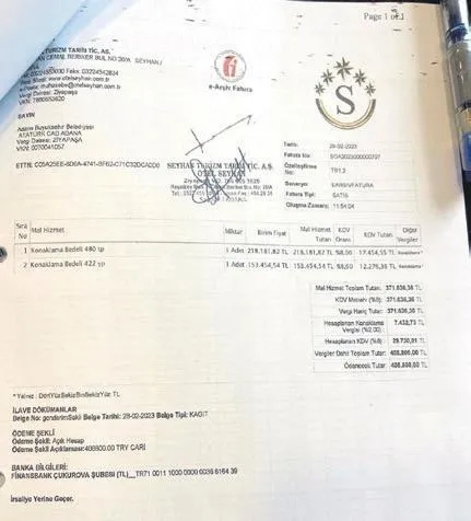 5 yıldızlı otel, 28 Şubat 2023 tarihinde Adana Büyükşehir Belediyesi'ne konaklamanın ödenmesi için 408 bin 800 TL'lik fatura gönderdi. Bunun üzerine Belediye Başkanı Zeydan Karalar'ın Özel Kalem Müdürü Ejder Mehmet Sıkık, 13 Mart 2023 tarihinde Mali Hizmetler Dairesi Başkanlığı'na fatura tutarının ödenmesi için e-imzalı yazı gönderdi.
