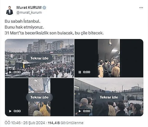 İstanbul haftanın ilk iş gününe yine ulaşım çilesiyle başladı. Yenikapı - Atatürk Havalimanı Metro Hattı'nda yaşanan arıza tüm istasyonları kilitled Yaşanan yoğunluğa tepki gösteren İBB Başkan adayı Murat Kurum, "Bunu hak etmiyoruz. 31 Mart'ta bu çile bitecek" dedi