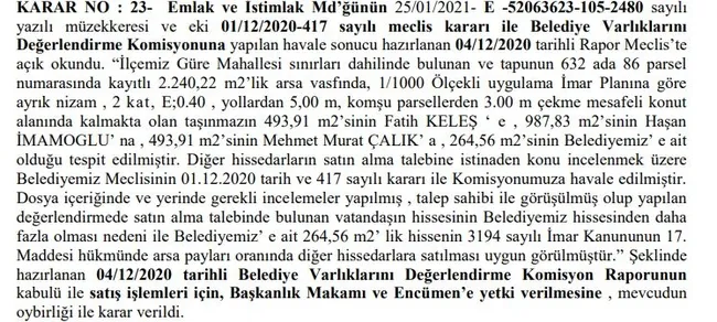 Fatih Keleş, Hasan İmamoğlu ve Mehmet Murat Çalık'ın; Edremit Belediyesi'nin sahibi olduğu 264,56 m2'lik arsayı da satın aldığı bildirildi. Edremit Belediyesi'nin 2 Şubat 2021 tarihli kararıyla 264,56 m2'lik arsa söz konusu kişilere satıldı.