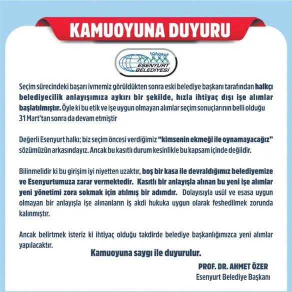 CHP'nin Esenyurt Belediye Başkan adayı olarak gösterdiği DEM Parti destekli Ahmet Özer, ilçede belediye başkanlığını kazandı. Ancak Özer'in ilk icraatı, daha önce belediye başkanlık koltuğunda oturan yine CHP'li Kemal Deniz Bozkurt'tan intikam almak oldu. Mazbatasını alarak göreve başlayan Özer, selefi tarafından işe alınan onlarca personelin iş akdini feshetti. Seçim süresince 'kimsenin ekmeğine dokunmayacağını' vaat eden Özer, pek çok yerde göreve gelen CHP'li başkanların yaptığı gibi verdiği sözü tutmayarak çok sayıda personelin iş akdini feshetti.