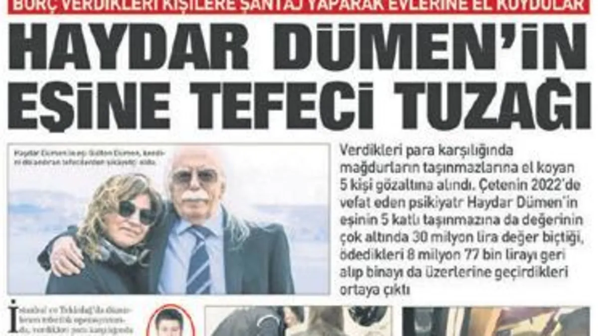 Merhum psikiyatr Haydar Dümen'in eşi Gülten Dümen'in de aralarında bulunduğu çok kişinin taşınmazlarına borca karşılık teminat adı altında el koyan çetenin İstanbul ve Tekirdağ'da düzenlenen operasyonda yakalanan 5 üyesi tutuklandı. Tutuklananlar arasında, çetenin firari lideri Tanju A.'nın kardeşi CHP Silivri İlçe Meclis Üyesi Rıza A. da bulunuyor. Firari Tanju A.'nın da aralarında bulunduğu 4 çete üyesini yakalama çalışmaları sürüyor. İddialara göre Gülten Dümen, yaşadığı maddi sıkıntılar nedeniyle Cihangir'deki 5 katlı taşınmazını satmak istedi. Apartmana değerinin çok altında olmak üzere 30 milyon lira değer biçen çete, bunun 8 milyon 77 bin lirasını ödedi. Ancak noterde satış gerçekleşir gerçekleşmez tapunun devrinin gerçekleştiği çete üyesi Emrah E. bloke koydukları parayı da geri çekti. Gülten Dümen ile buluşan çete üyeleri, Dümen'in kolundaki "Rolex" marka saati ve çantasındaki 10 bin doları da gasp etti.