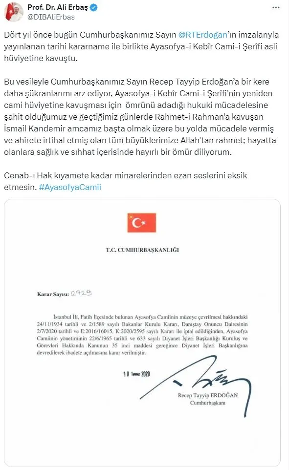 Diyanet İşleri Başkanı Erbaş, paylaşımında, Ayasofya'nın Ayasofya-i Kebir Cami-i Şerifi olarak ibadete açılmasına ilişkin 10 Temmuz 2020 tarihli Cumhurbaşkanı Kararı'na da yer verdi.