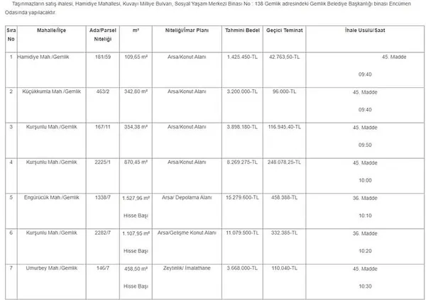 Gemlik Belediye Başkanı CHP'li Şükrü Deviren, kentin gözde noktalarında bulunan ve birçoğu deniz manzarasına sahip Belediye arsalarını satışa çıkardı. Mülkiyeti Belediyeye ait olan 5 farklı mahallede 7 ayrı arsa, 1.5 milyon TL ile 15 milyon TL arasında değişen bedellerle ihale usulü ile satışa çıkarıldı. Toplamda 46 milyon 820 bin TL'lik ihalelerin, 12 Eylül günü gerçekleştirileceği duyurulurken, bazı vatandaşlar, seçim vaatlerinin aksine Belediye taşınmazlarının satışına tepki gösterdi.