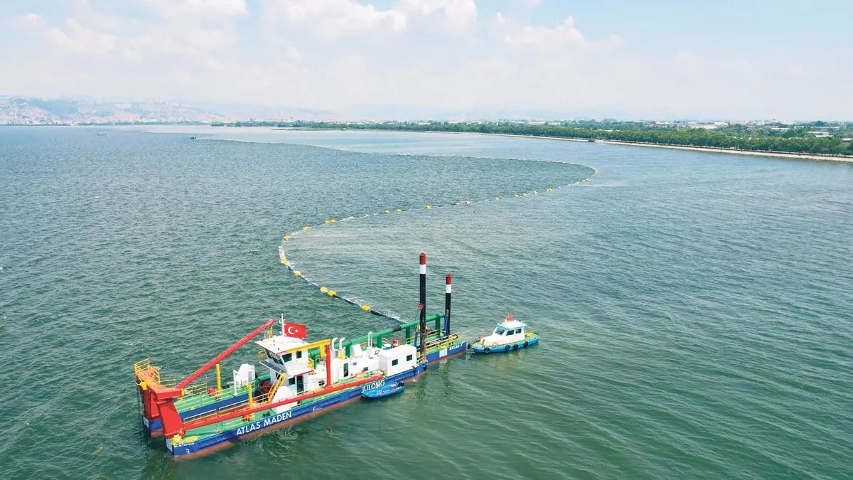 İzmit Körfezi Dip Çamuru Temizliğinin Marmara'ya yeniden hayat vereceğini söyleyen Başkan Büyükakın şunları söyledi: "Denizde biriken çamur çekiliyor. Çekilen çamur membran tüplerin içine sulu bir şekilde pompalanıyor.