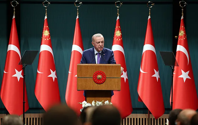 "Anadolu topraklarında Selçuklu'dan Osmanlı'ya ve nihayet Cumhuriyete uzanan devletlerimizin mirası olan bağımsız, güçlü, onurlu, müreffeh Türkiye'yi ilelebet payidar kılmakta kararlıyız. Millet olarak Cumhurbaşkanlığı forsumuzdaki 16 yıldızda manasını bulan 2 bin 200 yılı aşan köklü bir devlet geleneğine sahibiz. Bu birikimi soydaşlarımızın ve dostlarımızın da iştirakiyle insanlığın ortak mirasına en büyük katkıyı sunacak şekilde kullanmayı, geliştirmeyi, güçlendirmeyi hedefliyoruz. Hem ülke sınırlarımız içinde, hem bölgemizde, hem dünyada barışın, huzurun, güvenliğin ve adaletin hakim kılınması için milletimizin bu kadim tarihi perspektifine ve medeniyet değerlerimize daha sıkı sarılacağız. Verdiğimiz mücadelenin gayesine, özellikle ulaşmasını ne terör örgütleri, ne yayılmacı heveslerle bölgemizi kana ve ateşe bulamaya çalışanlar, ne de onları destekleyip şımartan emperyalistler engelleyebilir. Bu amaçla nerede eksiğimiz varsa hepsini birer birer tamamlayarak ülkemizi muasır medeniyet seviyesinin üzerine çıkarmak için gece gündüz çalıştık çalışıyoruz. Milletimizin desteğiyle geride bıraktığımız bu dönemde çok büyük fedakarlıklar yaparak nice sinsî oyunları ve tuzakları bozarak nice hain saldırıları boşa çıkartarak gerçekten çok önemli kazanımlar elde ettik. Artık güvenlikten teknolojiye, diplomasiden ekonomiye her alanda yaptığımız fedakarlıkların karşılığını alacağımız bir sürecin arefesindeyiz.Türkiye Yüzyılı olarak adlandırdığımız aydınlık yarınlara kavuşmak için önümüzde aşmamız gereken az sayıda engel, çözmemiz gereken az sayıda sorun kaldı."
