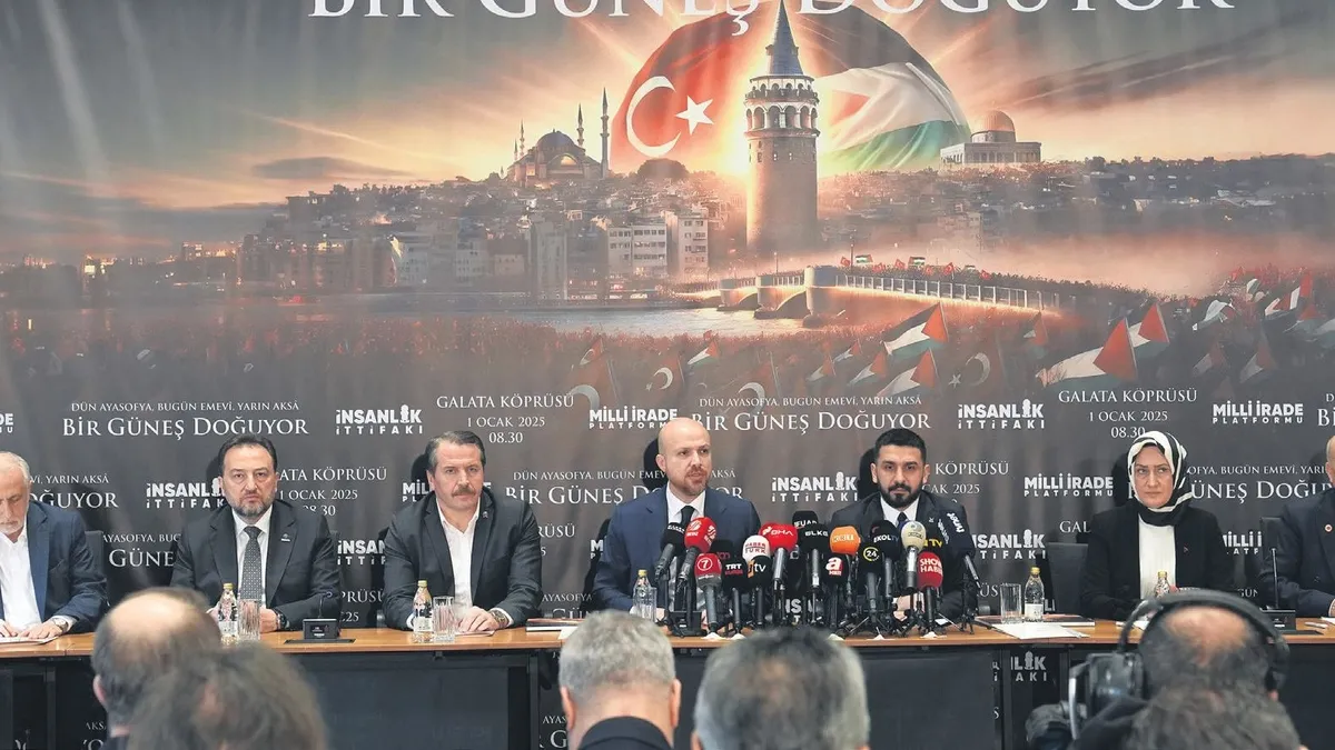 Türkiye'deki 308 sivil toplum kuruluşunun bir araya gelerek oluşturduğu Milli İrade Platformu üyeleri, İsrail'in katliamına "Dur" demek için 1 Ocak'ta Galata Köprüsü'nde eyleme katılım çağrısında bulundu. Platform üyeleri, Eyüpsultan'daki Türkiye Gençlik Vakfı (TÜGVA) Genel Merkezi'nde düzenlenen basın toplantısında "Dünyayı Uyandırıyoruz", "Dün Ayasofya, bugün Emevi, yarın Aksa" ve "Bir Güneş Doğuyor" sloganlarıyla düzenlenecek eyleme katılım çağrısı yaptı. TÜGVA Başkanı İbrahim Beşinci, 15 aydır dünyanın gözü önünde bir halkın yok edildiğini söyledi. İlim Yayma Vakfı Mütevelli Heyeti Başkanı ve TÜGVA Yüksek İstişare Kurulu Üyesi Bilal Erdoğan, mazlumların hakkını savunmaya ve Filistin davasını gündemde tutmaya devam edeceklerinin altını çizdi. Eylem kapsamında yeni yılın ilk gününde Ayasofya, Sultanahmet, Süleymaniye, Yeni Cami ve Fatih Camii'nde sabah namazında buluşulup kortejler eşliğinde Galata Köprüsü'ne yürünecek.