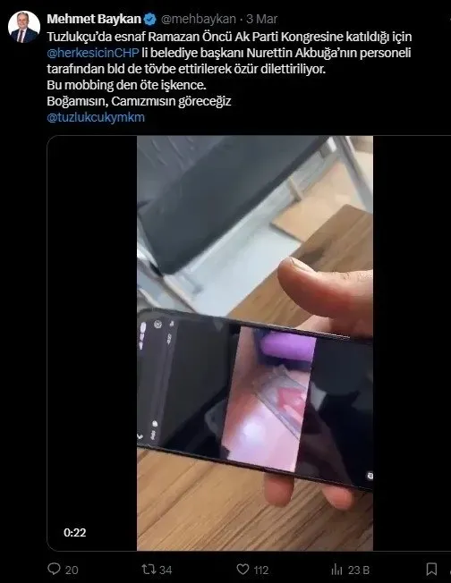 Konya'nın Turgutlu ilçesinde kaydedilen bir görüntü büyük tepki topladı. Söz konusu görüntüleri paylaşan AK Parti Konya Milletvekili Mehmet Baykan, "Bir esnaf, AK Parti Kongresine katıldığı için CHP'li Belediye Başkanı Nurettin Akbuğa’nın personeli tarafından belediyede tövbe ettirilerek özür dilettiriliyor" iddiasında bulundu.