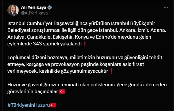Bakan Yerliklaya, İstanbul Büyükşehir Belediye Başkanı Ekrem İmamoğlu'nun gözaltına alınmasına ilişkin dün gece gerçekleştirilen izinsiz gösterilerde 343 şüphelinin gözaltına alındığını duyurdu.
