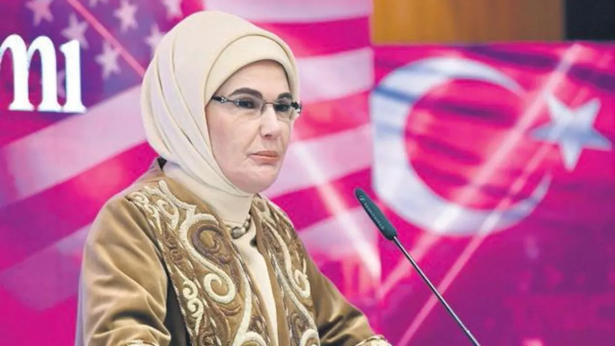 Emine Erdoğan, burada yaptığı konuşmada Türk-Amerikan toplumunun binlerce kilometre uzakta özverili çalışmalarla Türkiye'yi temsil ettiğine, milli kimliklerini ve tarihsel şuuru yeni nesillere aktararak koruduklarına işaret ederek, "Türk- Amerikan toplumu ve Amerikalı dostlarımız olarak 6 Şubat depremi sonrasında devletimiz ve halkımızla üstün bir dayanışma sergilediniz. Asrın felaketinde asrın dayanışmasının önemli paydaşları oldunuz. Ne kadar uzak olursak olalım, vatan sevgisi bizi birbirimize yakın kılar. Kalplerimizi, vatan toprağı yapar. Sizlerin kalbindeki Türkiye aşkını biliyor ve iyi günde, kötü günde, her daim verdiğiniz güçlü destek için her birinize teşekkür ediyorum" dedi.