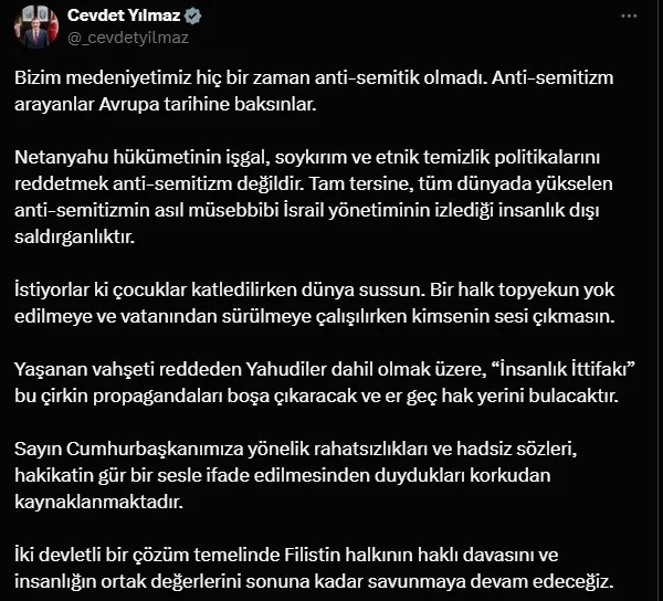 Cumhurbaşkanı Yardımcısı Cevdet Yılmaz: Bizim medeniyetimiz hiç bir zaman anti-semitik olmadı. Anti-semitizm arayanlar Avrupa tarihine baksınlar. Netanyahu hükümetinin işgal, soykırım ve etnik temizlik politikalarını reddetmek anti-semitizm değildir.
