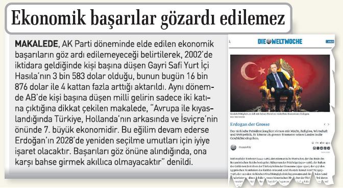 İsviçre'de 1934'te kurulan ve ana akım medyanın en önemli temsilcilerinden Die Weltwoche Dergisi'nde Francis Pike imzasıyla yayımlanan makalede, 23 yıldır iktidarda olan Cumhurbaşkanı Erdoğan'ın, Fatih Sultan Mehmed, Kanuni Sultan Süleyman, Yavuz Sultan Selim ve Mustafa Kemal Atatürk gibi isimlerle Türkiye'nin büyük tarihi liderleri listesinde yer alacağı vurgulandı.