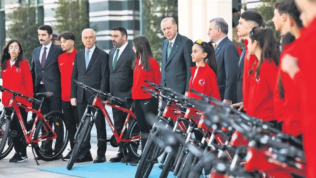 Cumhurbaşkanlığı Külliyesi'nde kabul etti. Külliye'nin bahçesinde milli bisikletçilerle bir araya gelip bir süre sohbet eden Erdoğan'ın, bisikletle tur atan gençlere seslenerek "Bir tur daha yapın" demesi gülüşmelere neden oldu" dedi.