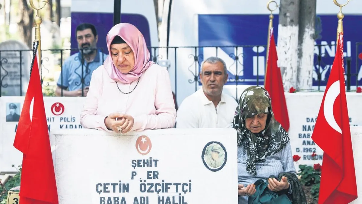 Terörsüz Türkiye adımları bizi umutlandırıyor" diye konuştu. Hakkâri'de terör saldırısı sonucu şehit olan Uzman Çavuş Melih Garip Ünsal'ın annesi Münevver Ünsal ise, "Oğlum şehit olduktan beri bana bayram da yok. Oğlum şehit oldu giderken beni de şehit annesi yaptı. Bu gururla her gün oğlumun yanına geliyorum" dedi. Pençe Kilit Harekâtı'nda şehit olan Piyade Uzman Çavuş Halil İbrahim Yiğit'in Edirnekapı Şehitliği'ndeki mezarını ziyaret eden baba Ragıp ve anne Nursen Yiğit, "Her bayram aynı acıyı yaşıyoruz. Kalbimiz sızlıyor" dedi.