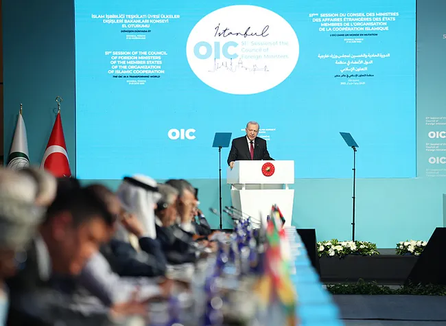Erdoğan, Lütfi Kırdar Kongre Merkezi'nde gerçekleştirilen İslam İşbirliği Teşkilatı (İİT) 51. Dışişleri Bakanları Konseyi Toplantısı'nda yaptığı konuşmada İslam dünyasının temsilcileriyle İstanbul'da bir araya gelmekten bahtiyarlık duyduğunu söyledi.