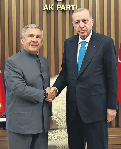 Başkan Erdoğan, Tataristan Cumhuriyeti Reisi Rüstem Minnihanov ile görüştü. AK Parti Genel Merkezi'ndeki kabul, basına kapalı olarak gerçekleşti. Erdoğan dün ayrıca Irak Temsilciler Meclisi Başkanı Mahmud Meşhedani'yi de kabul etti.