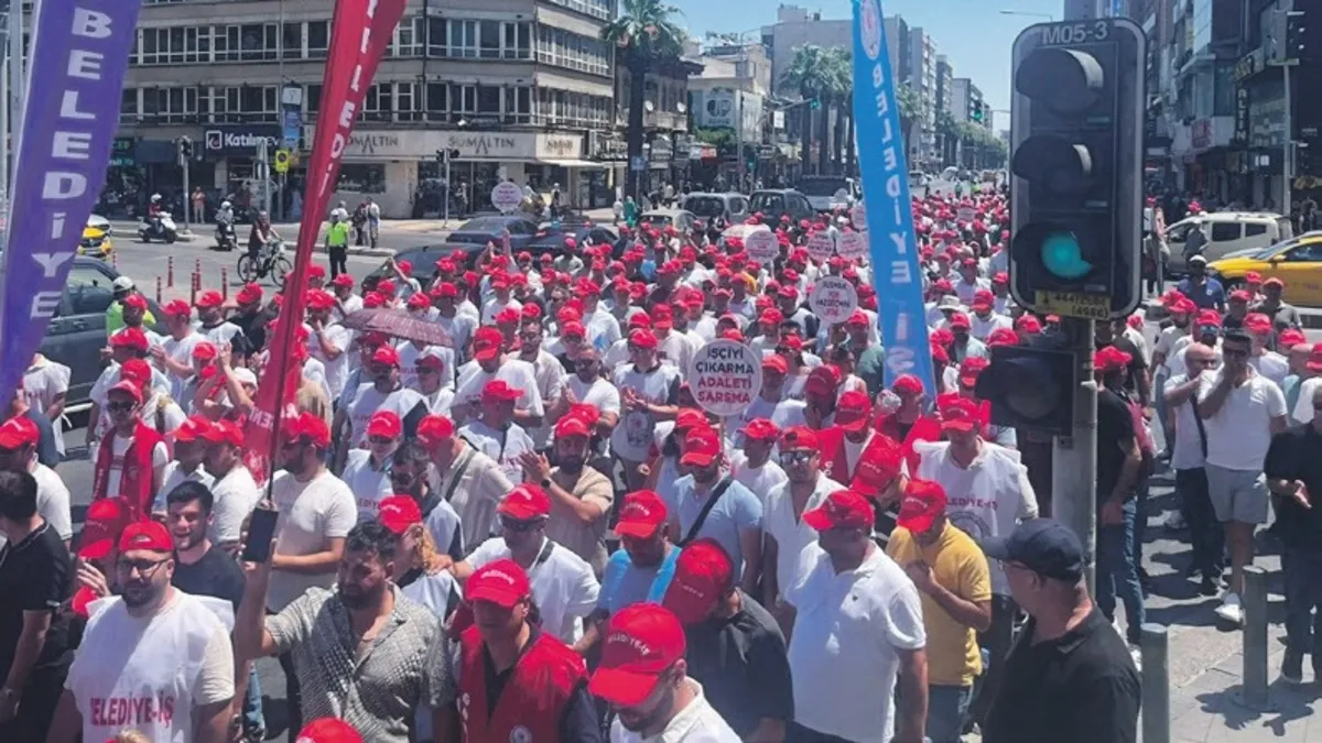 İzmir Büyükşehir Belediyesi'nin, önceki dönemde yapılan toplu iş sözleşmesini bahane ederek son 2 haftada 400 kişiyi kapıya koyması işçileri sokağa döktü. Belediye-İş Sendikası'nın çağrısıyla, dün erken saatlerde sendikanın Basmane'deki merkez binası önünde toplanan sendika üyesi işçiler, Başkan Cemil Tugay'ın makamının yer aldığı Egemenlik Evi'ne yürüyüşe geçti. 'İşten atılan işçiler işlerine geri alınsın' yazılı pankart taşıyan işçiler, yol boyunca sık sık "İşçiyiz, haklıyız, kazanacağız" sloganları attı. Sendika, kıyımlara karşı mücadelelerinin süreceğini belirtti.