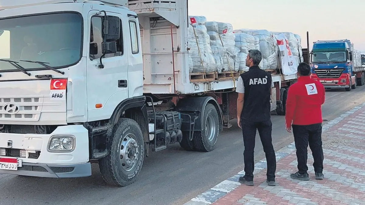 8 Ekim'de Gazze'de sağlanan ateşkes sonrasında insani yardım faaliyetlerinin hız kazandığı belirtilen açıklamada, "100 tır malzeme, AFAD koordinasyonu, Türk Kızılayı ve ülkemizdeki diğer STK'ların katkılarıyla gönderilen insani yardımların da bulunduğu sevkiyat kapsamında Mısır Kızılayı iş birliğiyle Mısır'ın El Ariş şehrinden Karem Ebu Salem sınır kapısına ulaştırılmıştır.