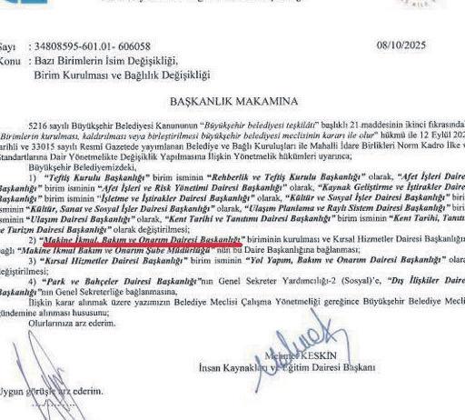 ANTALYA Büyükşehir Belediyesi'ne yönelik denetimler ve yargı süreçlerinin ardından makine ve araç bakımı konusunda yeni bir daire başkanlığı kurulması, mevcuttaki şube müdürlüğünün de bu daire başkanlığına bağlanması için adım atılmıştı. 13 Ekim 2025'te toplanan Antalya Büyükşehir Belediye Meclisi'nin gündemine sunulan teklifte, bazı birimlerinin adının değiştirilmesi ve yeni birim kurulması önerileri yer alıyor. Meclis gündeminin 70. maddesinde yer alan teklif ya bugün yapılacak oturumda oylanacak ya da ilgili komisyona havale edilerek önümüzdeki meclis oturumunda görüşülecek.