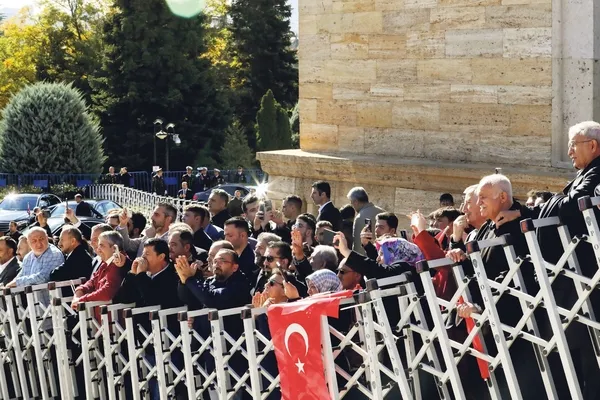 Cumhuriyet Bayramı ve Cumhuriyet'in ilanının 102'nci yıldönümü kutlamaları kapsamında ilk tören, Anıtkabir'de düzenlendi. Tören, devlet erkânının Aslanlı Yol'da yürüyüşüyle başladı. Erdoğan'ın, üzerinde ay yıldız bulunan çelengi Atatürk'ün mozolesine bırakmasının ardından saygı duruşunda bulunuldu ve İstiklal Marşı okundu. Daha sonra Erdoğan ve beraberindekiler, Misak-ı Milli Kulesi'ne geçti. Erdoğan, Anıtkabir Özel Defteri'ne şunları yazdı: