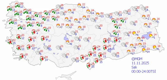 Meteoroloji Genel Müdürlüğü tarafından yapılan uyarıda, "Ülkemizin kuzeybatı kesimlerinin parçalı, yer yer çok bulutlu, Edirne, Tekirdağ ve Çanakkale çevrelerinin sağanak ve gök gürültülü sağanak yağışlı, diğer yerlerin az bulutlu ve açık geçeceği tahmin ediliyor." ifadelerine ye verildi.
