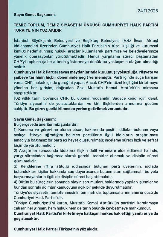 Cumhuriyet Halk Partisi'nde Kemal Kılıçdaroğlu'na yakınlığıyla bilinen bir grup milletvekili, CHP Genel Başkanı Özgür Özel'e hitaben bir mektup kaleme alıp "partide arınma" çağrısı yapmıştı. Bu çağrının ardından, "Hesap vermek her CHP'linin namus borcudur" diyen Kemal Kılıçdaroğlu, Ekrem İmamoğlu'nu ima ederek CHP'nin rüşvet çarklarının müteahhitleriyle anılamayacağını vurguladı ve partinin şeffaflık içinde acilen temizlenmesi gerektiğini söyledi. Yapılan çağrılara önceki akşam bir yenisi daha eklendi. 16 eski vekil bir mektup yayımladı. "Temiz toplum, temiz siyasetin öncüsü Cumhuriyet Halk Partisi, Türkiye'nin yüz akıdır" başlığıyla yazılan bildiride Özel'e hitaben 4 "öneri"de bulunuldu. İşte bildirideki öneriler: