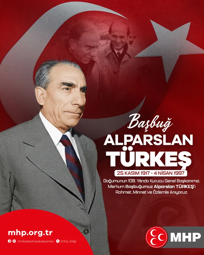 MHP'nin NSosyal hesabından yapılan paylaşımda, "Doğumunun 108. yılında kurucu genel başkanımız, merhum Başbuğumuz Alparslan Türkeş'i rahmet, minnet ve özlemle anıyoruz." ifadelerine yer verildi.