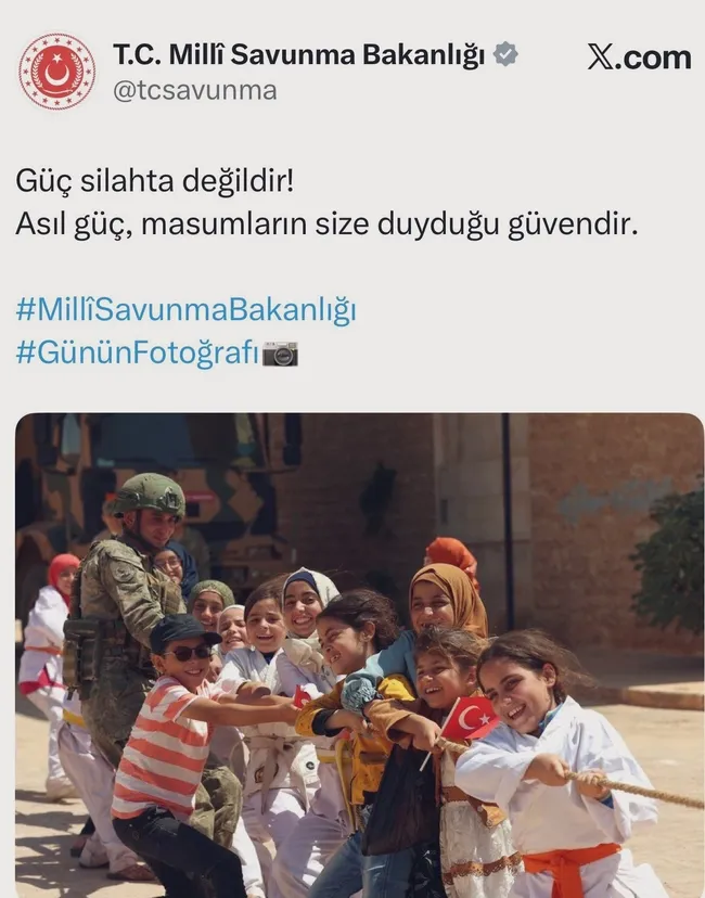 Milli Savunma Bakanlığı, kendisini taklit eden ve hadsiz kıyaslamada bulunan İsrail Savunma Bakanlığına Suriye'den paylaştığı fotoğrafla yanıt verdi. MSB'nin "Güç silahta değildir. Asıl güç, masumların size duyduğu güvendir" notuyla yaptığı paylaşım, sosyal medyada büyük beğeni topladı.