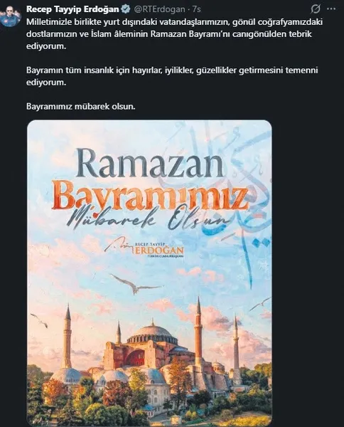 Bayram için sosyal medyadan da bir paylaşım yapan Başkan Erdoğan,"Milletimizle birlikte yurt dışındaki vatandaşlarımızın, gönül coğrafyamızdaki dostlarımızın ve İslam âleminin Ramazan Bayramı'nı canıgönülden tebrik ediyorum. Bayram insanlık için hayırlar getirsin" dedi.