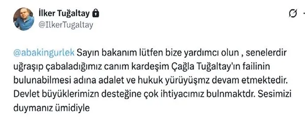 Çağla Tuğaltay'ın ağabeyi İlker Tuğaltay, "Devlet büyüklerimizin desteğine çok ihtiyacımız bulunmaktadır. Sesimizi duymanız ümidiyle"dedi. Ailenin avukatı Buket Gül ise "Vahşice işlenmiş ve faili 26 yıldır bulunamamış bu cinayetin aydınlatılması için DNA alımının hızlanması gerekiyor. Bu nedenle Sayın Adalet Bakanımız Akın Gürlek'in desteğini bekliyoruz" diye konuştu. Cinayet Büro ekipleri, mahallede o dönem yaşayanları yeniden mercek altına aldı.