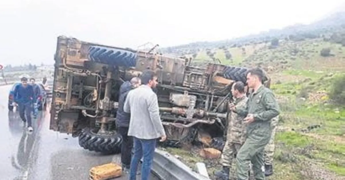 HATAY'IN Belen ilçesinde seyir halindeki askeri araç sürücünün direksiyon hâkimiyetini kaybetmesi sonucu kontrolden çıkarak yol kenarına devrildi. Kaza Belen Kıcı mevkiinde öğleden sonra meydana geldi. Antakya yönünde seyir halindeki askeri araç kuvvetli fırtına, yağış yüzünden yolun kaygan olması nedeniyle tek taraflı trafik kazası yaptı. Kontrolden çıkan askeri savrularak yol kenarındaki banket korkuluklarının üzerine devrildi. Asker taşıyan aracın tek taraflı trafik kazasında Mehmetçiği Allah korudu, can kaybı ve yaralanmanın olmadığı bildirildi. Askeri araç, gönderilen askeri vinç yardımıyla devrildiği yerde kaldırıldı.