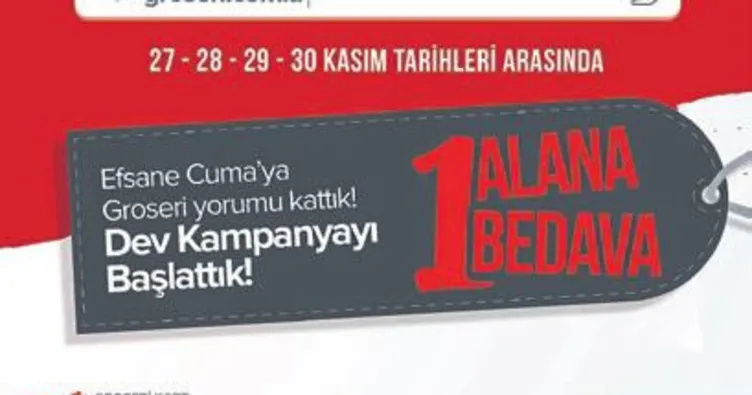 YILDA bir kez gelen Efsane Cuma Avantajları 28-30 Kasım tarihleri arasında pandemi sebebiyle sadece bu yıla özel Groseri com tr adresinden online olarak gerçekleşecektir. Efsane Cuma kampanyasına özel; et, balık, piliç, sebze- meyve, şarküteri, bakliyat, deterjan, kuruyemiş, pasta, diğer gıda ve gıda dışı reyonlarında dev indirimler, sürpriz fiyatlar ve 1 alana 1 bedava kampanyası gerçekleşecek. İndirimli ürünlerin, www.groseri.com.tr, Facebook (Groserimarket), Twitter (Groseri) ve Instagram (Groserimarket) sayfalarından takip edilebileceği belirtildi.