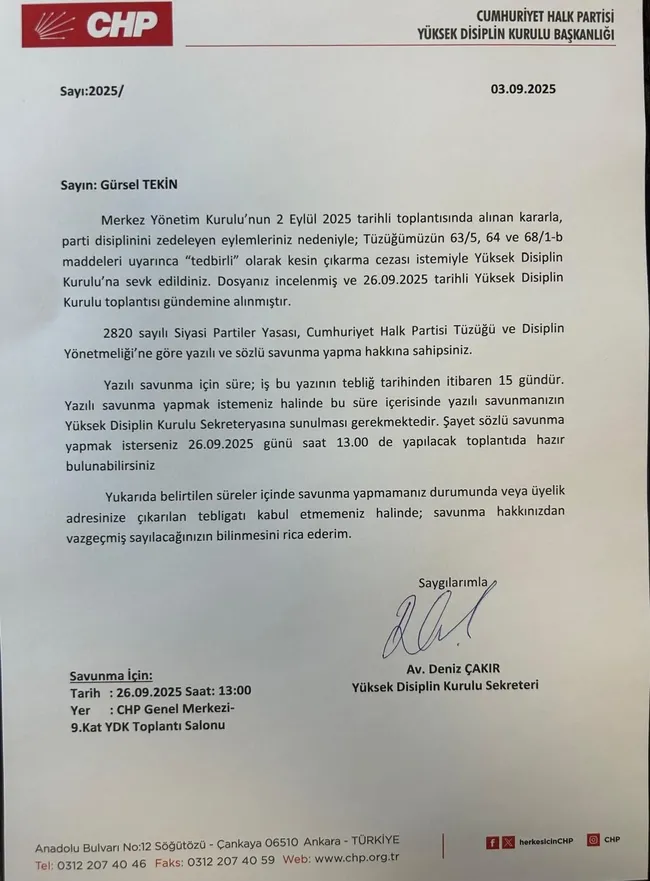 Son dakika haberleri... CHP MYK tarafından kesin ihraç talebiyle tedbirli olarak disipline sevk edilen Gürsel Tekin’den savunma istendi. Tekin, 15 gün içinde sözlü ya da yazılı savunma yapacak.