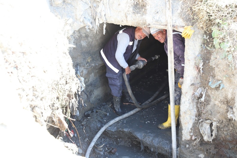 Hakkâri’nin Sümbül Mahallesi’nde önünde geçmekte olan 42 metre uzunluğunda ve 2 metre derinliğindeki menfez tıkandı. Bunun üzerine harekete geçen Belediye Fen İşleri Müdürlüğüne bağlı ekipler, tıkanan menfezi açmak için 4 iş makinesi ve 4 personel ile çalışma başlattı. 2 metre derinliğindeki menfezin içine giren belediye ekipleri, canla başla çalıştılar.